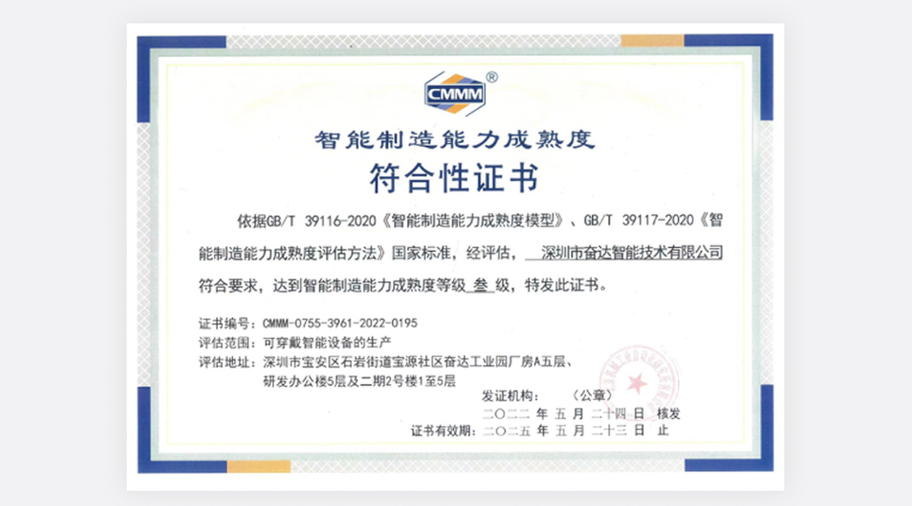 (图为美高梅智能技术智能制造能力成熟度三级评估证书) 智能制造能力成熟度模型描述了企业实施智能制造要达到的阶梯目标和演进路径,提出了实现智能制造的核心要素、特征和要求,从人员、技术、资源、制造等要素维度,从低到高分五个成熟度等级综合评价企业数字化、网络化、智能化发展水平。其中,一级为流程化管理(规划级),二级为数字化改造(规范级),三级为网络化集成(集成级),四级为智能化生产(优化级),五级为产业链创新(引领级)。美高梅智能于2015年落户深圳宝安区,作为深圳市美高梅科技股份有限公司的控股子公司,专注于可穿戴设备、运动健康、移动医疗和电声等领域的技术、产品和内容整合的研究、制造、生产;致力于与全球运动健康领域领先的头部品牌企业合作开发有竞争力的产品,具有为客户提供从创意设计、研究开发到产品实现的全流程技术实力。为了快速推进公司智改数转,实现高质量发展,本次CMMM评估团队由美高梅智能CEO肖晓发起,智能办公室牵头,联合制造中心、质量中心、信息中心、行政中心、采购部和人力资源等部门协同推进、共同参与。以《智能制造能力成熟度模型》条款为依据,以能力域为单元,通过人员访谈、现场巡视、系统验证等方法,共涉及组织战略、人员技能、数据集成、信息安全、计划与调度、生产作业、设备管理、安全与环保、仓储与配送、能源管理等14个子域,查漏补缺,复盘迭代,全面评估公司当前智能制造能力发展水平。此次评估是对企业智能制造能力的一次全面检验,帮助企业在智能制造转型升级阶段识别差距、确定目标、实施改进。本次共有45家企业通过智能制造成熟度评估,其中三级以上企业15家。创新是企业核心竞争力的源泉,美高梅科技将以智能制造能力成熟度三级为起点,进一步强化智能制造相关组织建设和人才管理,加快构建智能制造发展生态,深入推进数字化转型、智能化升级,不断增强公司竞争力。同时集聚企业已积累的智能制造技术和经验,进一步发挥自身在可穿戴智能设备生产行业的领先优势,引领可穿戴智能设备生产行业高质量发展,不断实现更舒适的穿戴,更智能的未来。