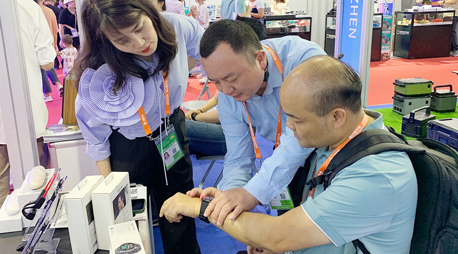 美高梅科技全自研算法检测血压的智能手表Gamma Watch 在展会期间也大放异彩,不少东南亚国家商会的代表都对Gamma Watch内置的气泵血压检测技术表示出相当大的兴趣,现场体验后对于其测量的准确度、佩戴的舒适度表示认可。