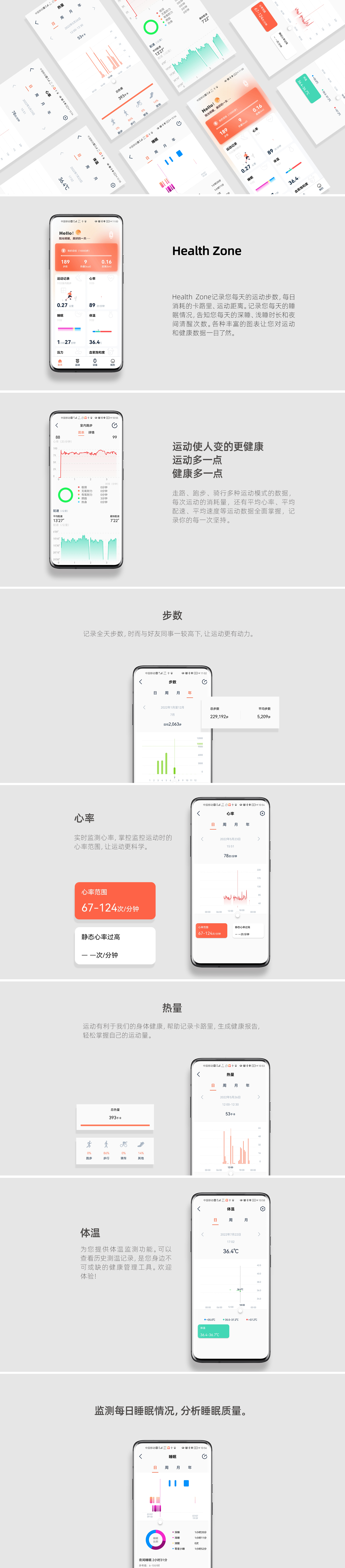 Health Zone记录您每天的运动步数,每日消耗的卡路里、运动距离。记录您每天的睡眠情况,告知您每天的深睡、浅睡时长和夜间清醒次数。各种丰富的图表让您对运动和健康数据一目了然。